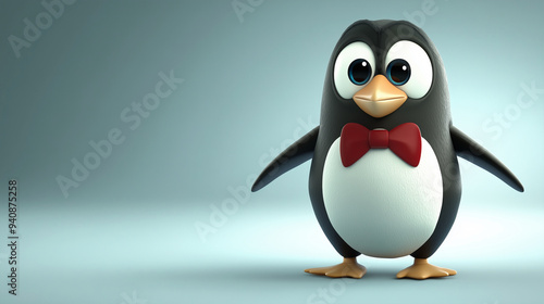 Fototapeta premium A cute cartoon penguin: Small, round black and white body, wearing a red bowtie, large gleaming eyes, cartoon style with a cool blue gradient background..