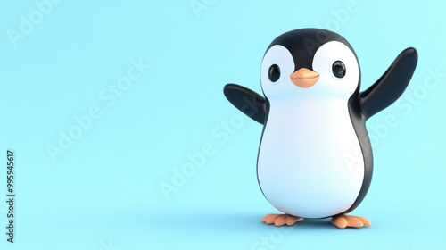© Napasnan, Obraz premium A cute cartoon penguin waving, isolated on a pastel blue background