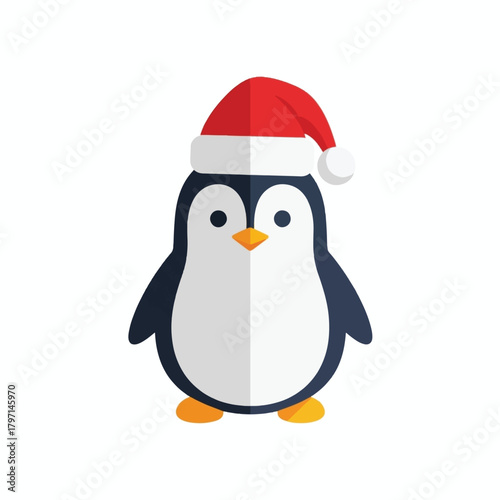 © TheNanokha, Obraz premium A cute cartoon penguin wearing a red Santa hat, standing on a white background, perfect for Christmas themes.