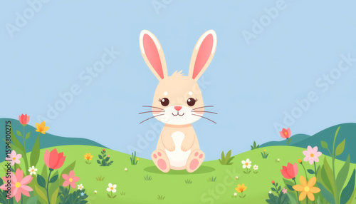 Fototapeta premium A cute cartoon rabbit sitting in a colorful flower meadow under a clear blue sky.