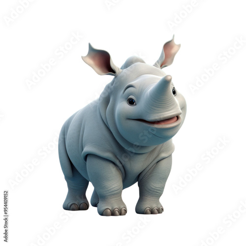 © Khaula_Annasya, Fototapeta premium A cute, cartoon rhinoceros with a big smile, standing against a black background.