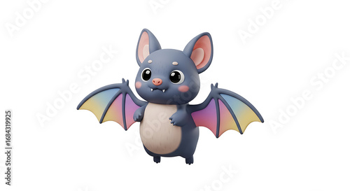 Obraz premium A cute, cartoon-style bat with rainbow-colored wings stands with a friendly expression against a white background.