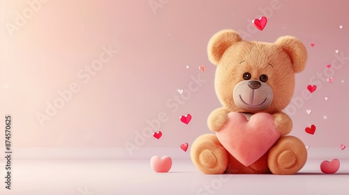 © MP_Artworks, Obraz premium A cute cartoon teddy bear hugging a heart, with a sweet smile, on a light pink background
