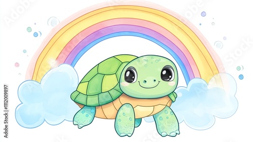 © Morning, Obraz premium A cute cartoon turtle with a rainbow above it.