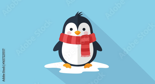 Naklejka premium A cute, cartoonish penguin wearing a red striped scarf stands on a small patch of ice against a light blue background with a long shadow.