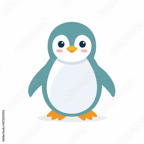 © Feri, Fototapeta premium A cute, cartoonish penguin with teal and white plumage stands facing forward with its flippers outstretched slightly.