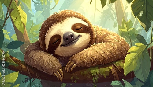 © Ngn, Naklejka premium A cute, cartoonish sloth smiles contentedly while resting on a thick tree branch, surrounded by lush green foliage. The scene is bright and sunny