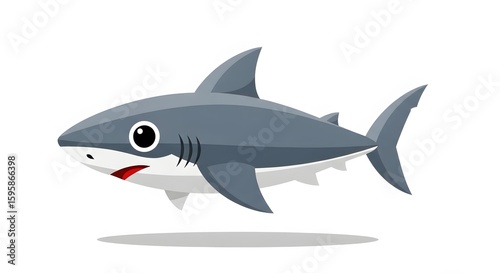 © ENDRA, Naklejka premium A cute, cartoonstyle grey shark with big eyes and a friendly smile swims on a white background, isolated