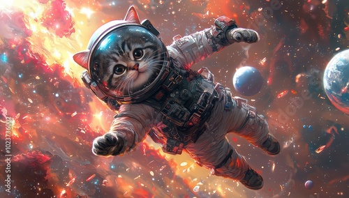 Fototapeta premium A cute cat astronaut floating in space, surrounded by colorful planets and...