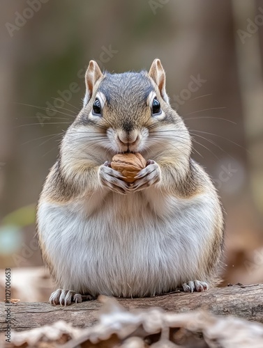 © BerkahStock, Obraz premium A cute chipmunk holding a nut while sitting on a log in a natural setting.