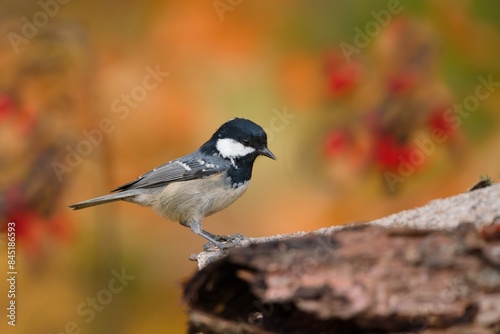 © Monikasurzin, Fototapeta premium A cute coal tit sits on a piece of tree bark. Portrait of a small titmouse. Periparus ater