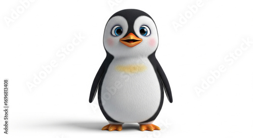 © rizkimalik, Fototapeta premium A cute 3D animated baby penguin character with big blue eyes and rosy cheeks standing on a clean white background.