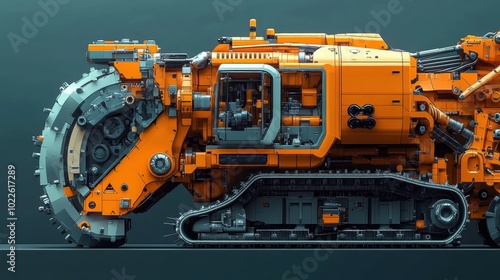 Fototapeta premium A cute 3D technical drawing of a harvester, showcasing the machine mechanical details with rounded edges and a bright, appealing color palette. The close-up view highlights the technical precision in
