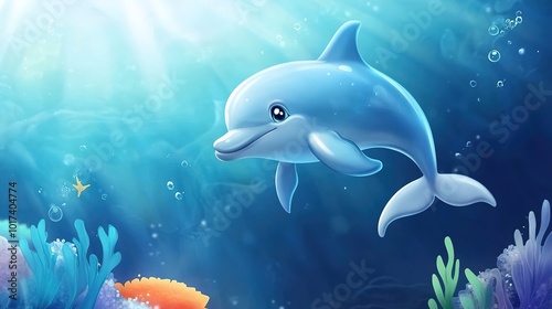 Fototapeta premium A Cute Dolphin Cartoon Character with a Playful Expression, Swimming Joyfully in a Vibrant Ocean. This Adorable Illustration Features Big, Sparkling Eyes, a Smiling Face, and Bubbles Surrounding