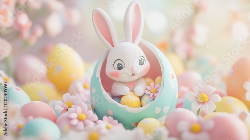 © Ailee Tian, Obraz premium A cute Easter bunny inside an open, colorful egg with flowers and eggs around it.