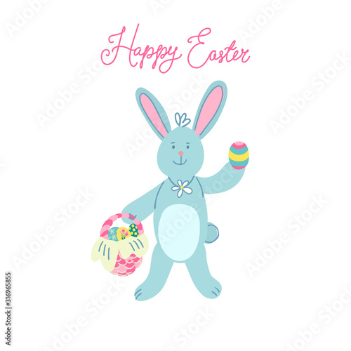 © Anna Druzhkova, Obraz premium A cute Easter bunny with a wicker basket full of easter eggs. Hand drawn vector illustration isolated on white background. Happy Easter lettering.