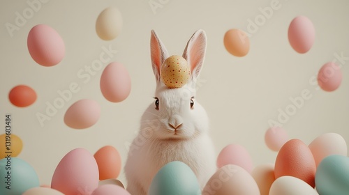 Fototapeta premium A cute Easter bunny with an Easter egg on its head on a pastel background.