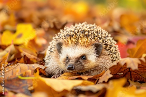 Fototapeta premium A cute European hedgehog curled up in a ball on a bed of autumn leaves