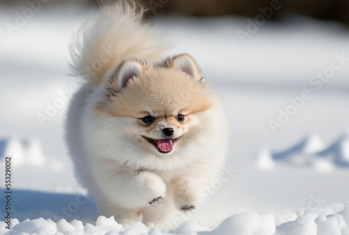 © Tarunabh, Fototapeta premium A Cute Fluffy Pomeranian Puppy Dog, with a Winter Snow background. Generative AI.