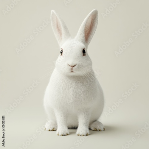 © Trionorejo, Fototapeta premium A cute, fluffy white rabbit sitting calmly against a plain background.
