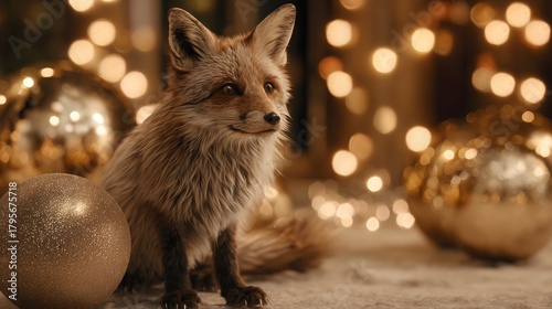 Obraz premium A cute fox sits amongst shimmering holiday ornaments and bokeh lights, creating a magical and festiv