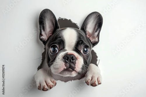 Fototapeta premium a cute French Bulldog Peeking Through Torn Paper
