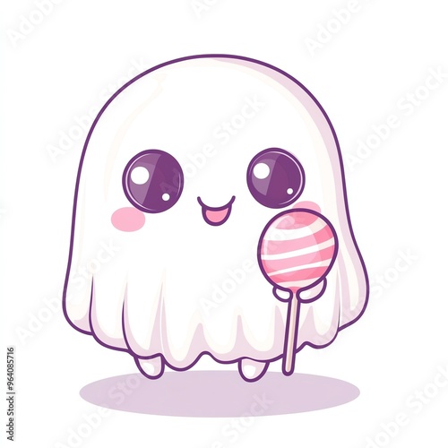 Obraz premium A cute ghost holding a candy, kawaii style, blush cheeks, pastel colors, isolated on white background