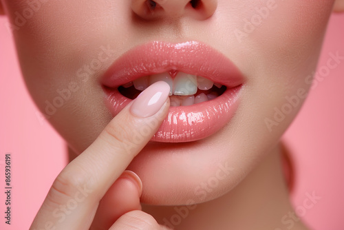 © Khawla, Obraz premium A cute girl having fun laughing with a perfect white teeth smile, happy and joyful. In front of a soft peach background