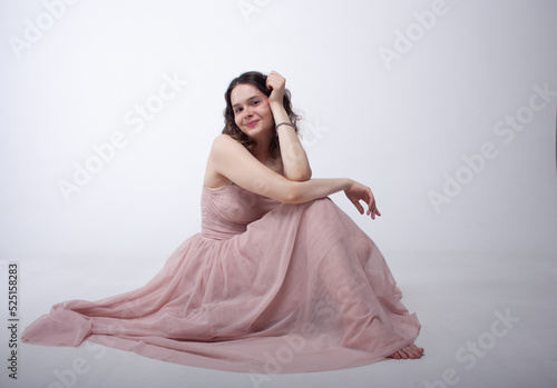 © Екатерина Зубарева, Fototapeta premium A cute girl in a pink long dress is sitting, leaning her head on her hand and smiling. The girl looks at the camera.