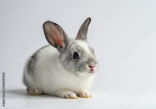 © Vooglo.com, Obraz premium A cute gray and white bunny rabbit sits on a white background looking directly at the viewer