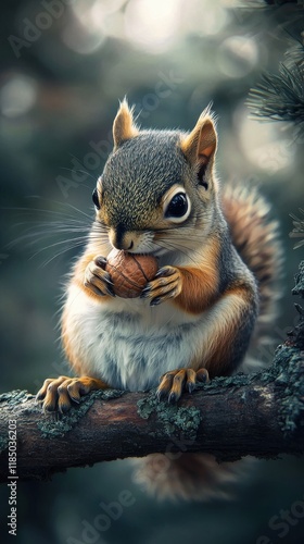 © Espresso, Obraz premium A cute gray squirrel holding an acorn, perched on a branch amidst a blurred forest background.