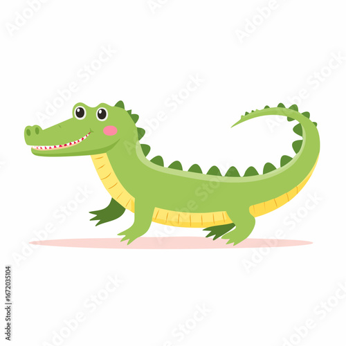 © Feri, Fototapeta premium A cute green cartoon alligator with a happy smile and sharp teeth walking on a white background.