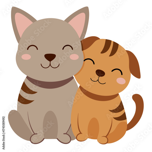 © TahrinAkther, Fototapeta premium A cute grey tabby cat and a brown puppy hugging affectionately with happy closed eye animal vector on white background.