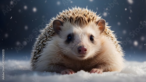 © Mehak, Obraz premium A cute hedgehog amidst a cold scene with snowflakes falling.