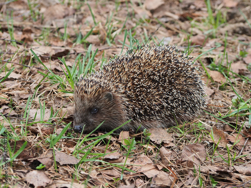 © wpg77, Naklejka premium A cute hedgehog, out of hibernation, walks among the fallen leaves and grass in the spring forest. Hedgehog, portrait in profile, close-up.