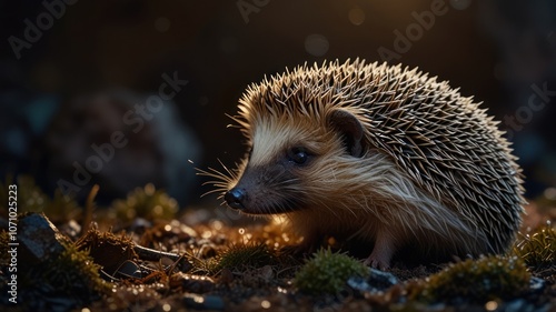 Fototapeta premium a cute hedgehog standing on a wet forest floor. The hedgehog's spiky fur,...