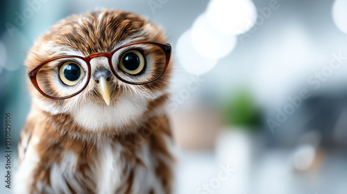 © Phuwadon, Fototapeta premium A cute, intelligent owl wearing glasses, showcasing a whimsical and charming look in a soft blurred background.