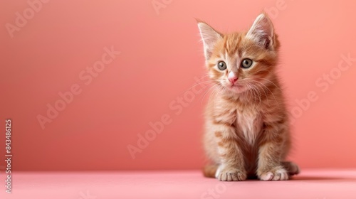 Obraz premium A cute kitten on a solid coral background with space above for text