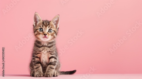 Fototapeta premium A cute kitten sitting on a solid pastel rose background, space above for text