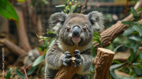 Fototapeta premium A cute koala climbs on a bamboo branch, with a focused, wide shot giving a...