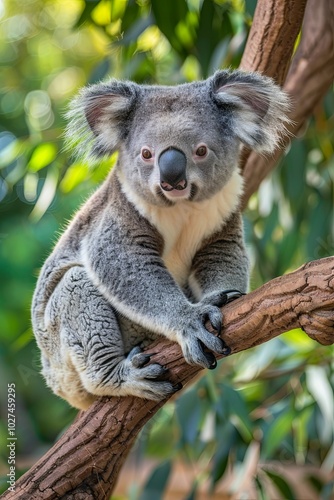 © dekreatif, Fototapeta premium A cute koala sitting on a tree branch, looking directly at the camera.
