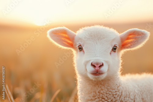 © Pui, Fototapeta premium A cute lamb stands in a sunlit field, capturing the essence of tranquility and natural beauty at sunset.