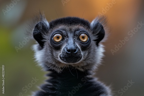 Naklejka premium A cute lemur with big eyes, looking at the camera, isolated against a blurred background. Soft sunlight. Close-up portrait.