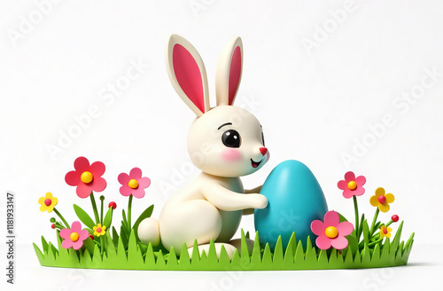 Fototapeta premium A cute little rabbit next to an Easter egg with a place for a banner text, a...