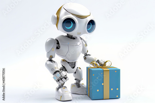 Naklejka premium A cute little robot place hand on the gift box isolated on white background,...