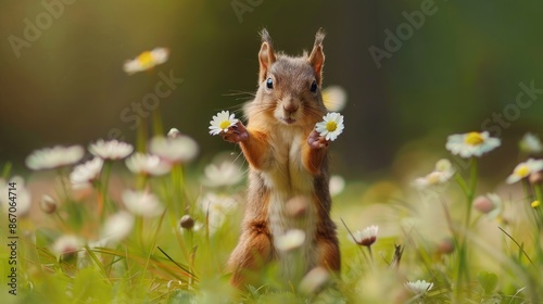 © art, Obraz premium a cute little squirrel stood behind him in a bed of daisies