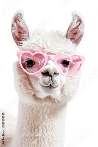 Obraz premium A cute llama poses confidently, wearing pink heart-shaped sunglasses. The isolated subject stands out against a transparent backdrop, showcasing its playful character