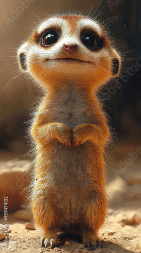 Fototapeta premium A cute meerkat with big, curious eyes looks directly at the camera, standing...