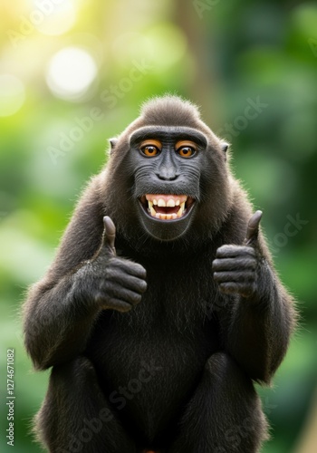 © Deamard, Obraz premium A cute monkey joyfully giving a thumbs-up, perfect for fun and motivational designs.