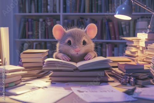 © Harsha, Fototapeta premium A cute mouse engrossed in reading a book surrounded by a pile of books in a library.